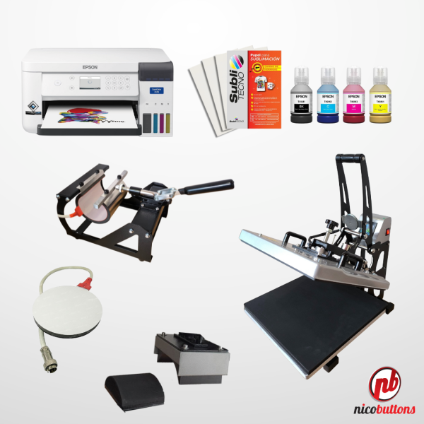Combo de Sublimación textil: IMPRESORA EPSON F170 + JUEGO DE TINTAS + RESMA A4 + ESTAMPADORA 38×38 + SUBLIMADORA DE GORRAS