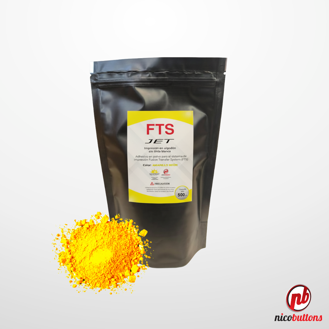 El polvo adhesivo FTS POWDER AMARILLO NEÓN está formulado con pigmentos fluorescentes. Es ideal para moda deportiva, streetwear y diseños de alto contraste.